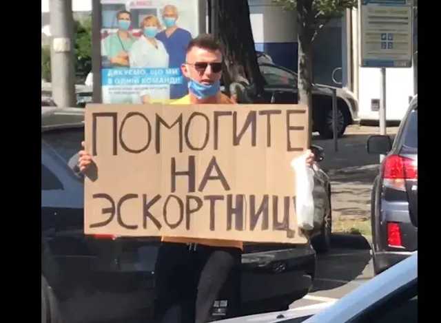 Мужчина с медицинской маской на бороде и картонным плакатом в руках устроил необычный сбор средств на проезжей части улицы. На табличке надпись: «Помогите на эскортницу».