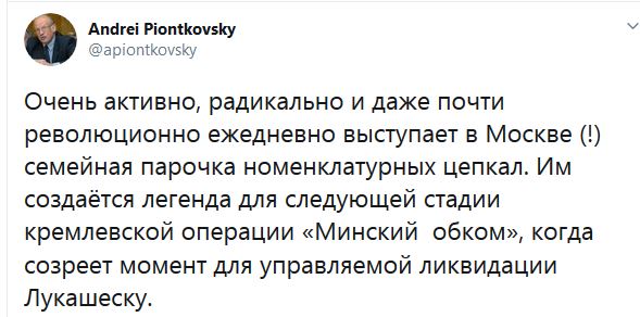 По его словам, сейчас в Москве «радикально и почти революционно» выступает «семейная парочка номенклатурных цепкал». «Им создается легенда для следующей стадии кремлевской операции „Минский обком“, когда созреет момент для управляемой ликвидации Лукашеску», — добавляет Пионтковский.
