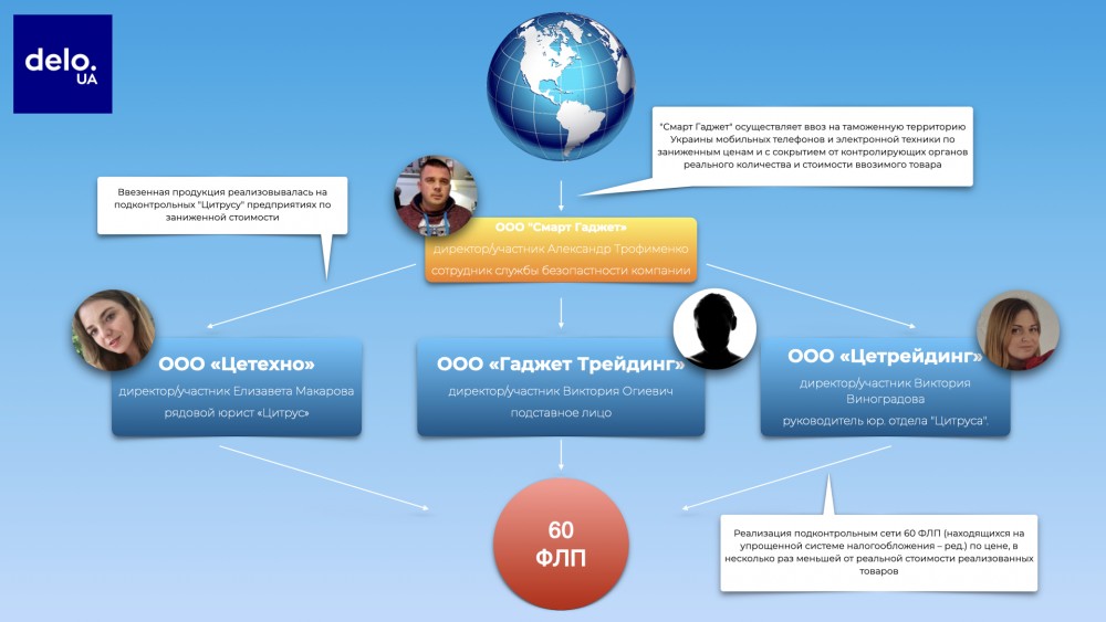 В дальнейшем, по данным следствия, ввезенная продукция реализовывалась на подконтрольных "Цитрусу" предприятиях. Которые, в свою очередь, документально отражают ее реализацию подконтрольным сети 60 ФЛП (находящихся на упрощенной системе налогообложения — Delo.ua) по цене в несколько раз меньшей от реальной стоимости реализованных товаров.