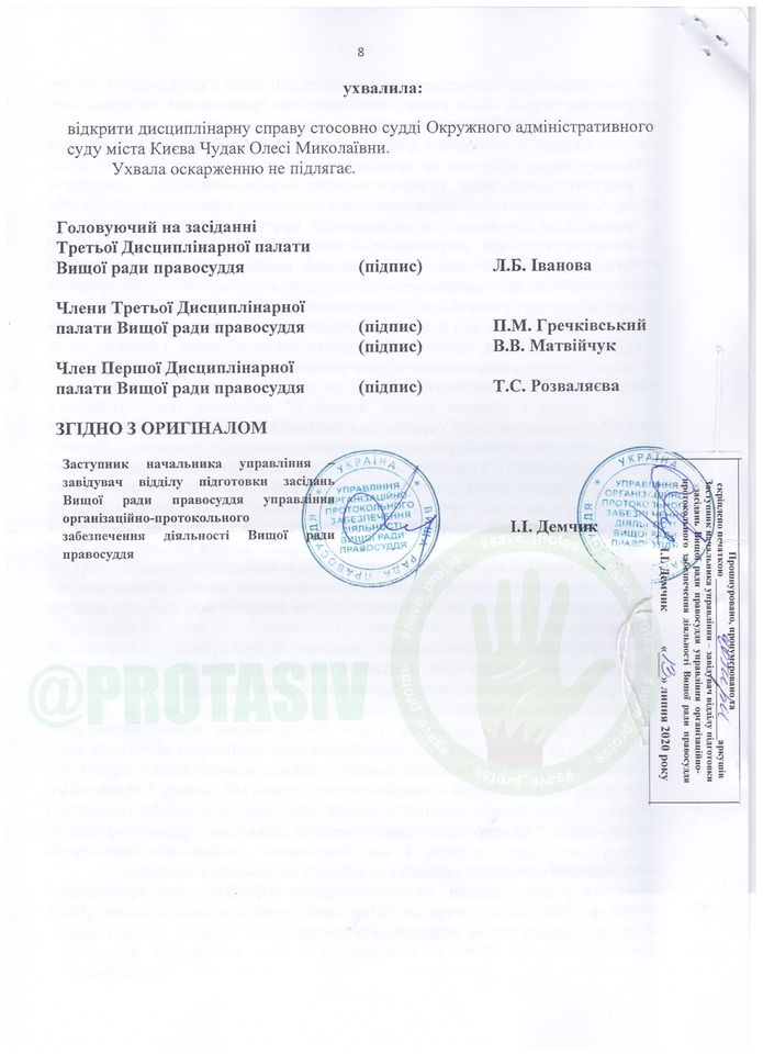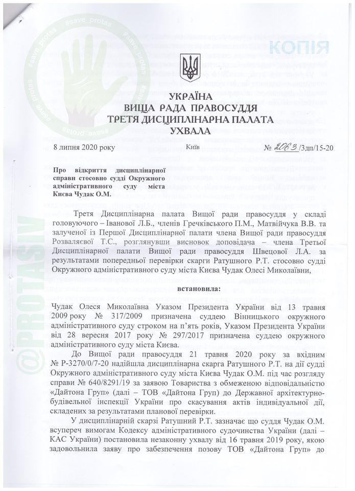 И месяц назад, по жалобе представителя общины Протасова Яра Roman Ratushnyy, Высший совет правосудия открыл дисциплинарное производство против судьи Чудак А.Н.