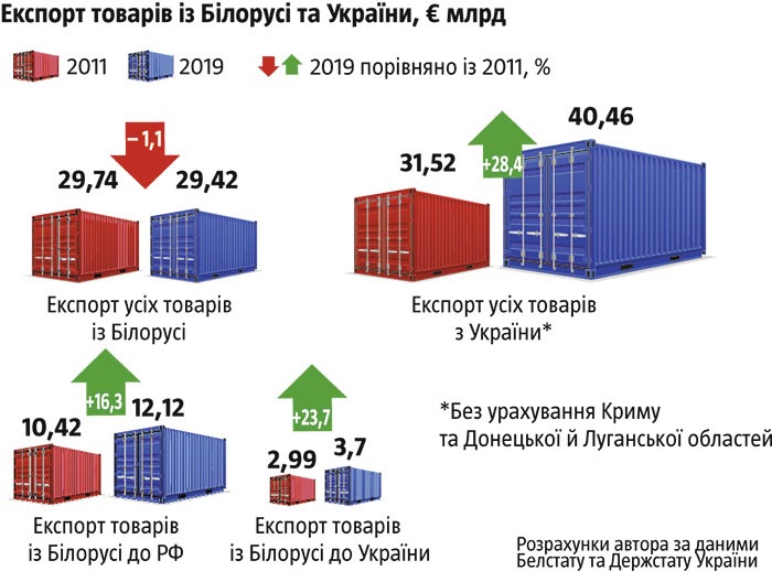 Поэтому, несмотря на попытки паразитировать на российском рынке и преференциальных условиях получения энергоносителей, стагнация в белорусской экономике - и особенно в промышленности - продолжается почти десятилетие (по сравнению с 2011 годом ВВП на одного жителя страны вырос всего на 4,9%). В то же время Украина нарастила производство (прирост ВВП на одного жителя без оккупированных территорий составляет 7,1%), и это несмотря на почти полное сворачивание торговли с Россией и переход на рыночные цены энергоносителей. Причем в 2018-2019 годах рост экономики Беларуси все ощутимее отставал от украинского.