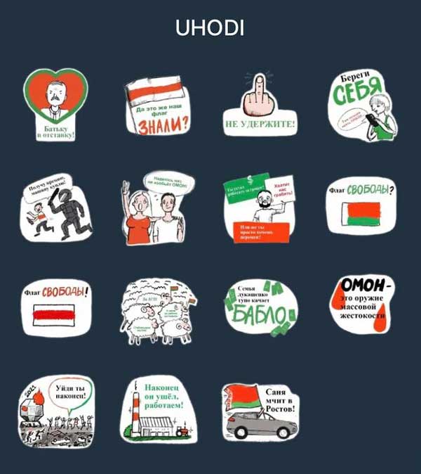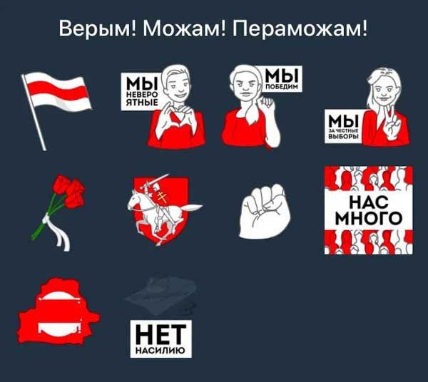 Не смог устоять от «борьбы стикеров» и официальный канал мессенджера Telegram: 15 августа он запустил официальный канал Беларуси и даже нарисовал специальные стикеры с медведем, рыбкой, Светланой Тихановской и лозунгом «Жыве Беларусь».