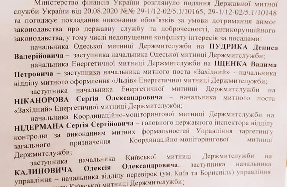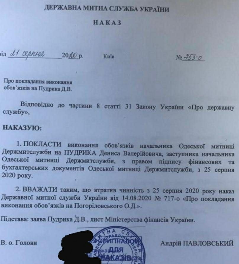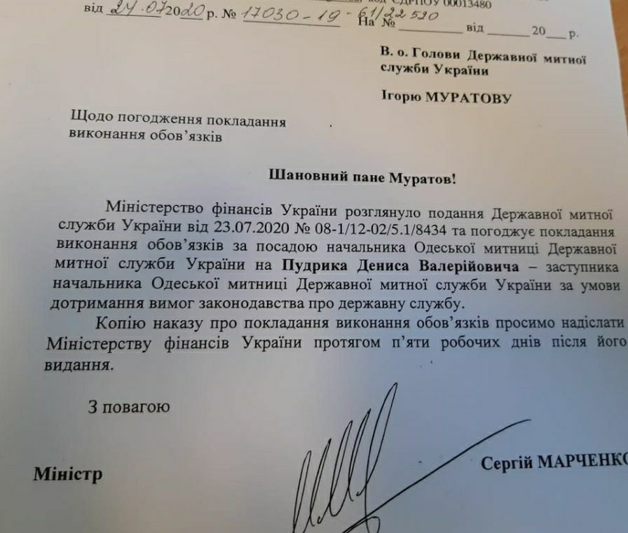 Попытка поставить Пудрика была еще 24 июля когда Марченко подписал назначение Пудрика на и.о. начальника Одесской таможни.