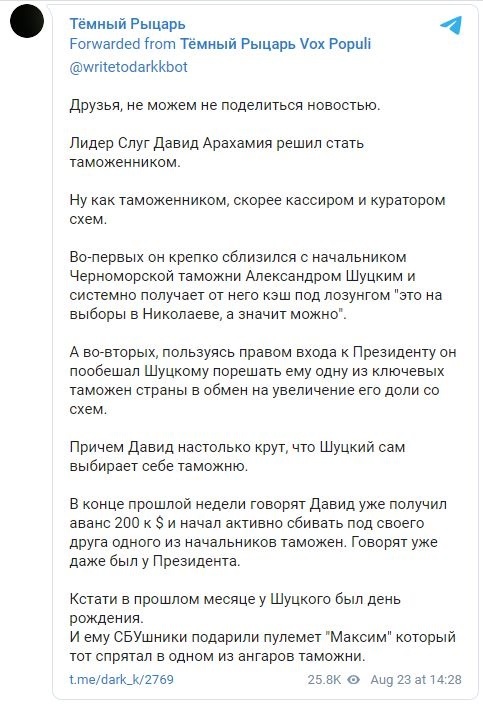 В Телеграм канале "Темный рыцарь" появилась информация о том, что Арахамия сильно сблизился с и.о. начальника Черноморской таможни Александром Шуцким.