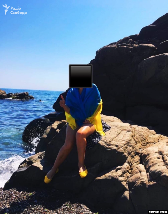 Также журналисты получили фото от жительницы Керчи, которая завернулась в украинский флаг на фоне моря в аннексированном Крыму.