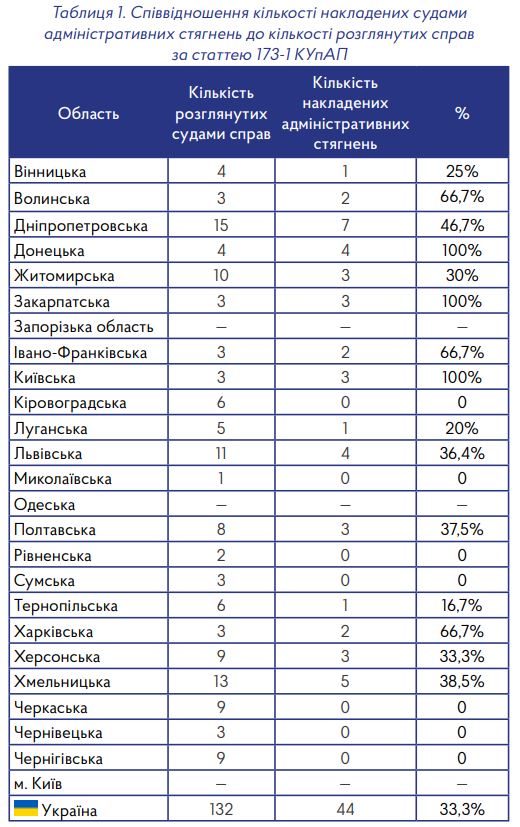 Найбільшу активність у складанні протоколів за статтею 173-1 КУпАП продемонстрували поліцейські Дніпропетровської (15 протоколів за якими покарано 7 осіб), Хмельницької (13 протоколів, покарано 5 осіб) та Львівської (11 протоколів, покарано 4 особи) областей.