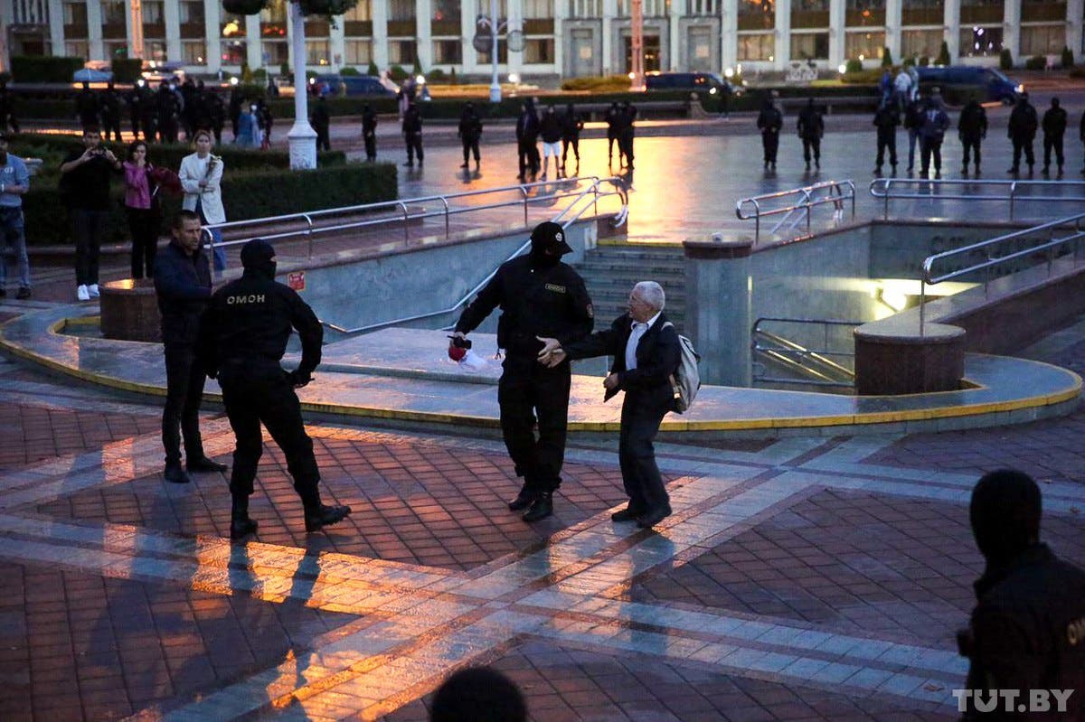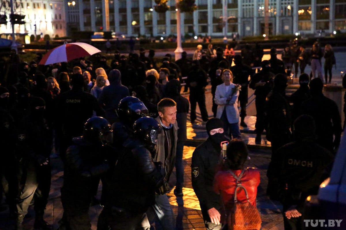 Около 20:30 на площади появился ОМОН и рассеял толпу. Когда же часть оппозиционеров, в том числе и журналисты, забежали в Костел святого Симеона и святой Елены, правоохранители заперли двери снаружи.