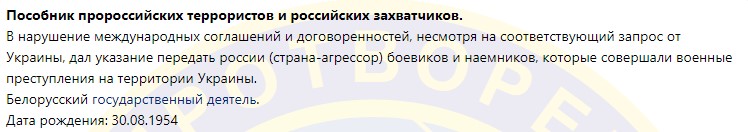 Александр Лукашенко внесен в базу «Чистилище» сайта «Миротворец». Это случилось после того, как Беларусь проигнорировала запрос из Украины и выдала России воевавших на Донбассе «вагнеровцев». В досье на Лукашенко он указан как «пособник пророссийских террористов и российских захватчиков».