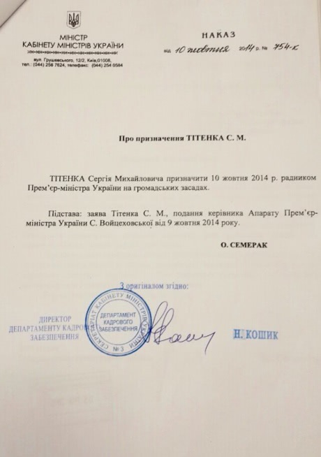 Згідно із документами, які Найєму надали в секретаріаті Кабміну, Титенко був призначений 2 жовтня 2014 року, але через тиждень звільнився, щоб наступного ж дня після звільнення знову стати радником, але тепер на громадських засадах.