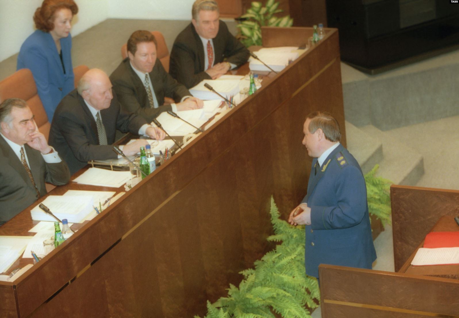 Юрий Скуратов во время обсуждения Советом Федерации вопроса о его отставке, 1999 год