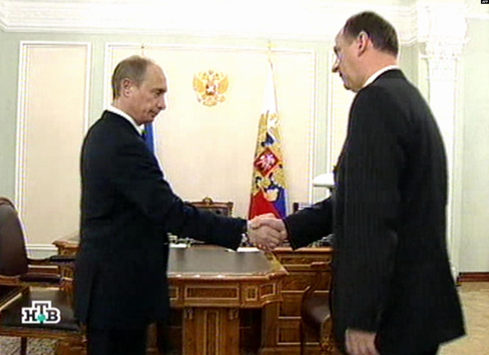 Путин пожимает руку директору ФСБ Патрушеву в день убийства Аслана Масхадова. Март 2005 года