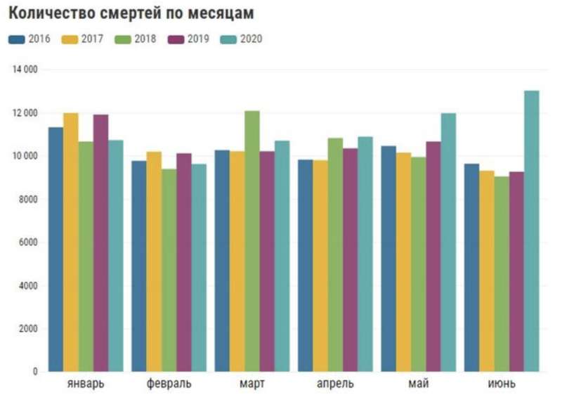 Стоит подчеркнуть, что в данных ООН не указана причина смертности. Соответственно, нельзя однозначно сказать, что рост смертности связан с эпидемией коронавируса или другими заболеваниями. Однако по этим данным видно, что в 2020 году с февраля количество смертей постепенно увеличивается, достигая самой большой отметки в июне Если в 2019 году в июне было 9263 смерти, то в июне 2020 года — 13 016.