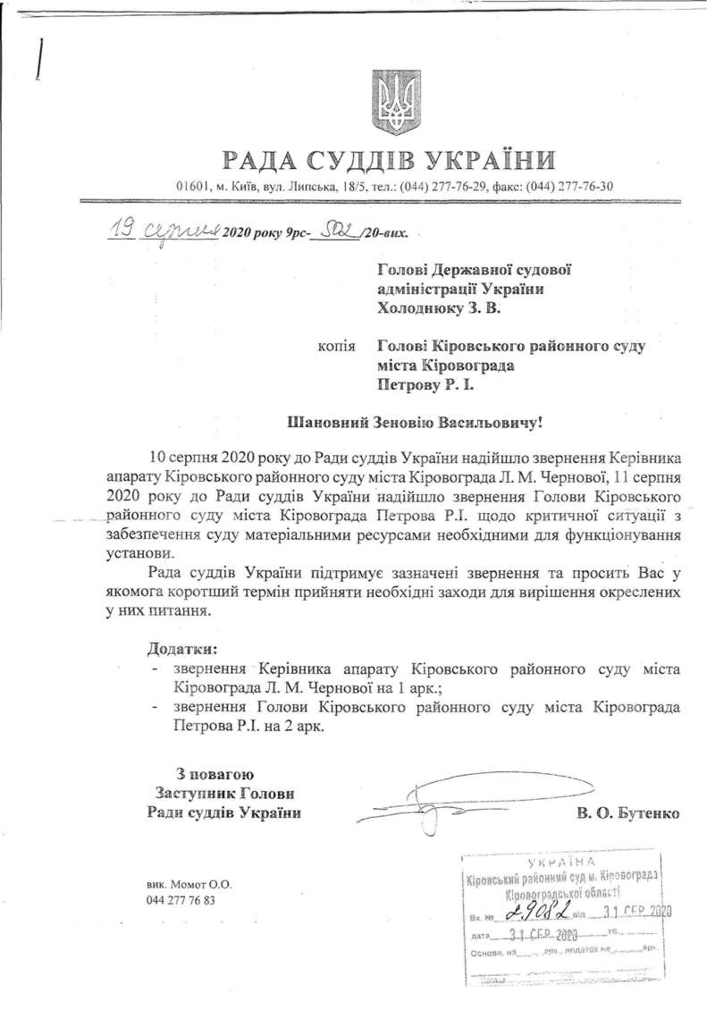 В частности, указано, что в Кировском райсуде сложилась критическая ситуация с обеспечением суда необходимыми материальными ресурсами для продолжения судопроизводства (почтовые отправления, содержание помещений и прочее).