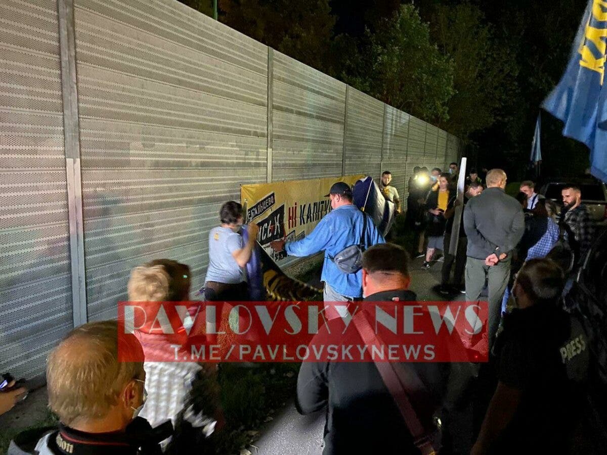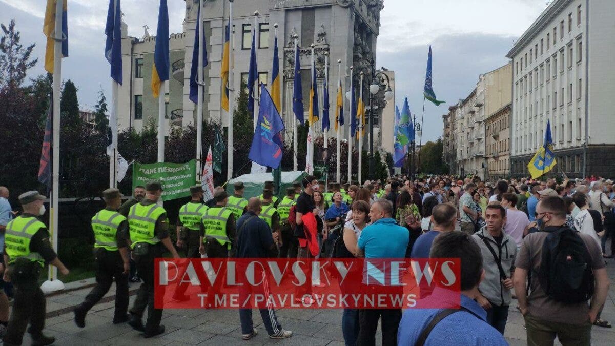 Вечером в четверг, 10 сентября, в Киеве у здания Офиса президента активисты протестовали против планов совместной инспекции украинских позиций у поселка Шумы на Донбассе. Об этом сообщает Telegram-канал Pavlovsky News.