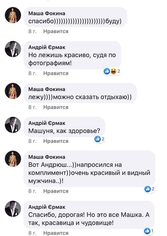 Также он выложил в сеть скрин переписки Ермака с Фокиной, свидетельствующий о теплоте и даже близости их отношений.