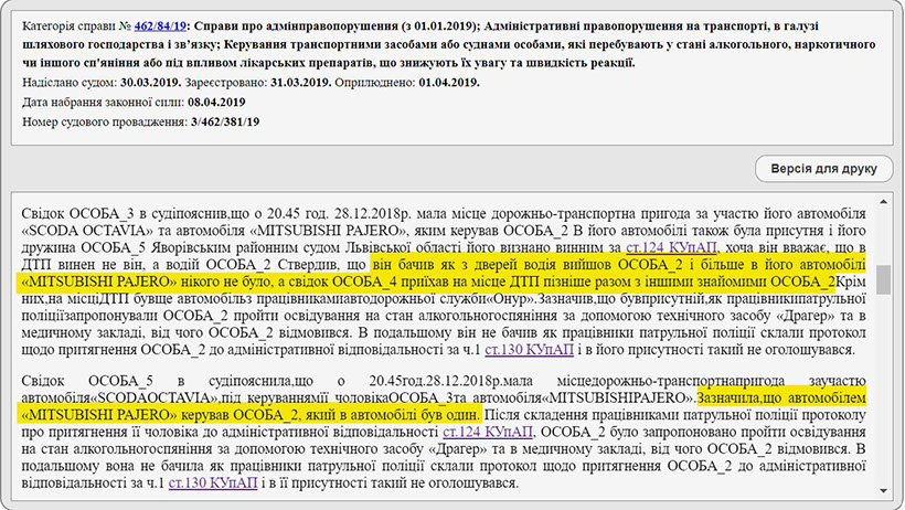 Тільки от інший учасник ДТП і пасажир вказували, що за кермом автомобіля MITSUBISHI PAJERO був саме Сисюк, який в салоні був один. Його ж товариш із групою підтримки приїхав згодом і взяв відповідальність на себе.