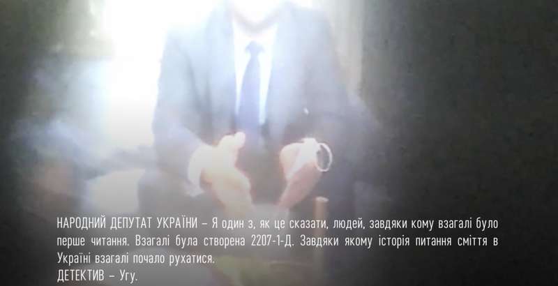 Вечером 14 сентября редактор интернет-издания «Цензор.net» Юрий Бутусов написал длинный пост в фейсбуке, где сообщил, не называя источники, что депутат Александр Юрченко и его неофициальный помощник Иван Фищенко пойманы на взятке за регистрацию законопроекта о внесении правок в Закон «Об управлении отходами». Фактически, он обнародовал часть данных досудебного следствия, детально описывая хронологию событий с 9 июля – первой встречи Фищенко и Демченко. Позже эту информацию подтвердил прокурор Специализированной антикоррупционной прокуратуры (САП) Андрей Перов, представляя в Высшем антикоррупционном суде (ВАКС) ходатайство об избрании меры пресечения для Фищенко. Картину дополнили аудио и видеозаписи оперативного наблюдения, выложенные в открытый доступ Национальным антикоррупционным бюро. НАБУ утверждает, что на них именно Фищенко, Демченко и Юрченко, хотя экспертизу голоса еще не провели.