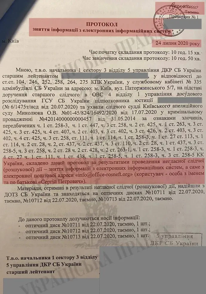 В нем сказано, что сотрудник СБУ ознакомился с информацией электронной почты «[email protected]». Ею пользовался человек с именем «Сергей Петрович».