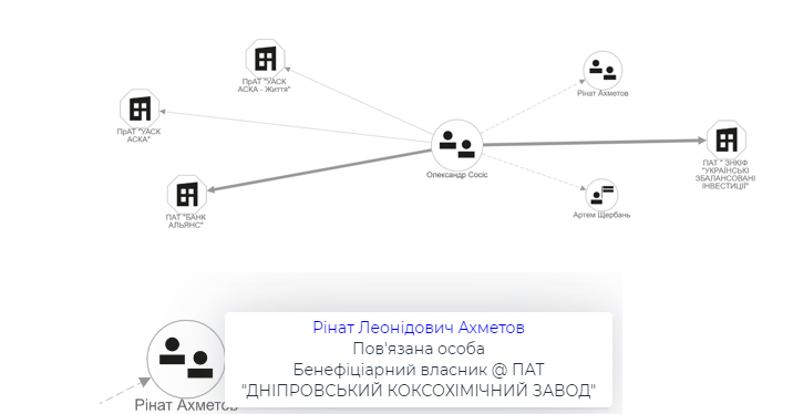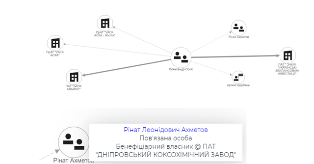 Согласно сайту https://pep.org.ua , деловые связи у Александра Сокиса есть с Ахметовым. Связаны они «Днепровским коксохимическим заводом».