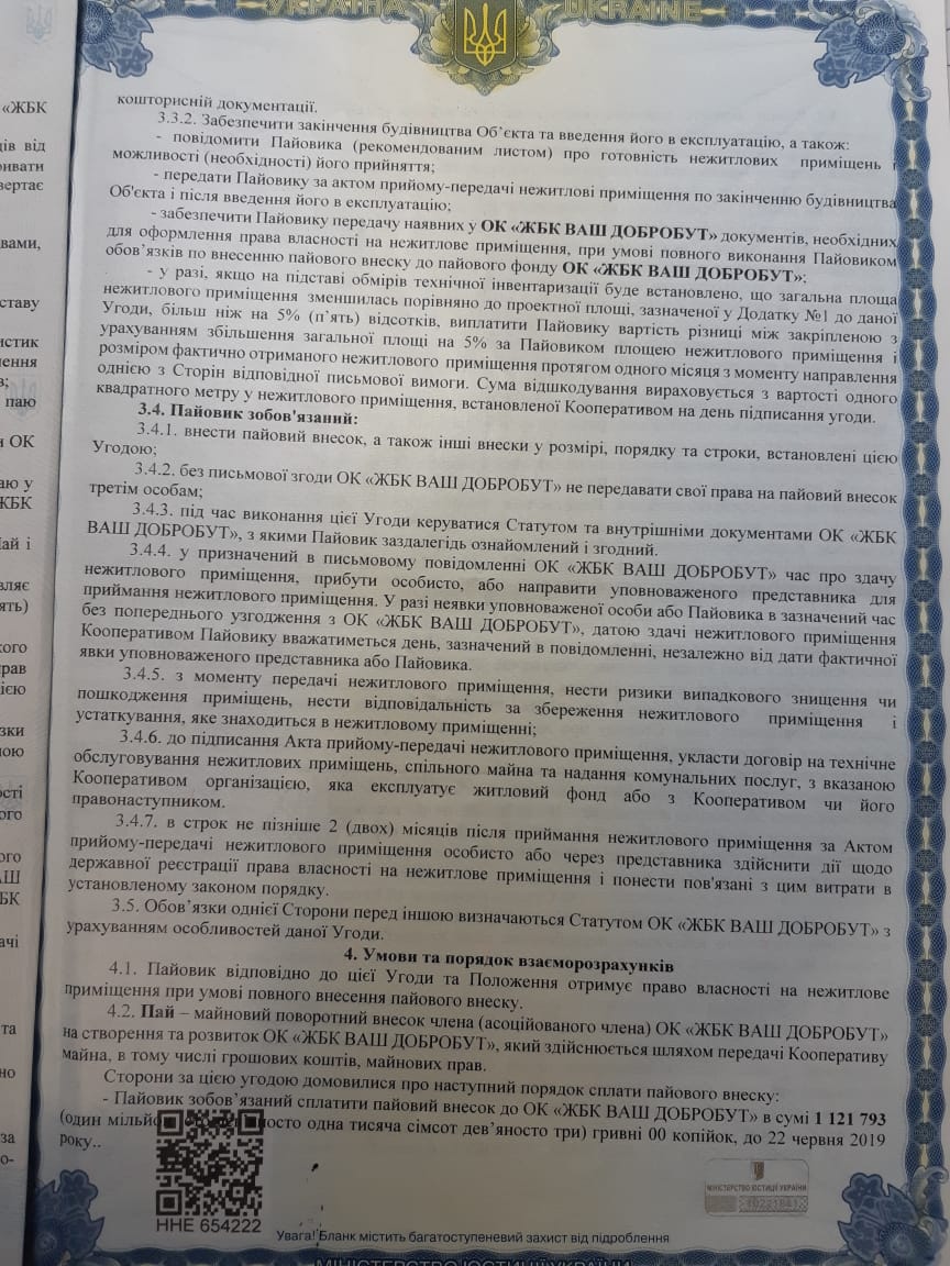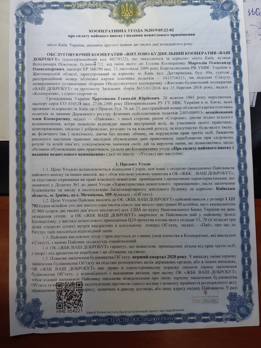 После этого в состав правления ЖК «Ваш добробут» приходят новые люди, которые, кстати, вкладывают в строительство 20 млн гривен собственных денег, не продав на тот момент ни одного квадратного метра на этом объекте. Поскольку Василий Троцько и Александр Марголин не передали новому руководству кооператива никаких документов о продаже цокольных помещений – их выставляют на продажу. И вот тогда обнаруживаются все двойные и тройные продажи, совершенные первыми основателями кооператива до 2018 года. Возникает скандал. А за ним – конфликт между частью пайщиков и новым руководством кооператива.