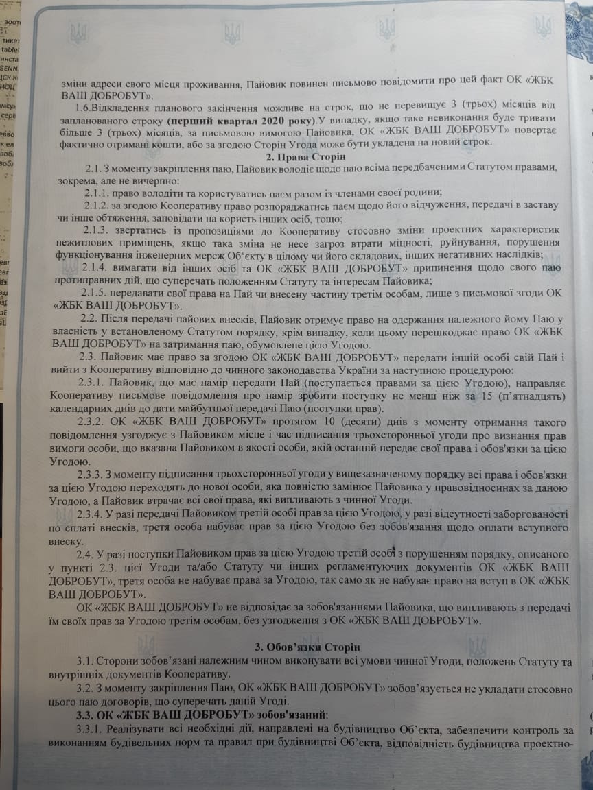 В 2019 году строительство на какое-то время приостанавливается. Как поясняли основатели кооператива: ибо в стране экономический кризис, стройматериалы дорожают, инфляция растет, ну и вообще «возникают проблемы». И уходят от этих проблем в прямом смысле – то есть выходят из состава правления кооператива «Ваш добробут». Причем – вместе со всеми документами. То есть отказавшись передавать всю документацию о совершенных ими сделках новым членам правления кооператива.
