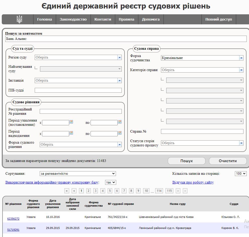 В Единственном государственном реестре судебных решений по запросу «Банк Альянс» имеется 11 483 различных решений только в сфере уголовного права. Если вникнуть в суть большинства из них – банк открывает счета для компаний, которые занимаются незаконной деятельностью (легализация доходов, добытых преступных способом, фиктивное предпринимательство, контрабанда и другие). Поэтому, правоохранители постоянно требуют в рамках уголовного процесса, получить данные банковской тайны о деятельности предприятий, которые подозреваются в совершении преступлений. В 90 % случаев, суд обязывал «Банк Альянс» предоставить информацию о клиентах.
