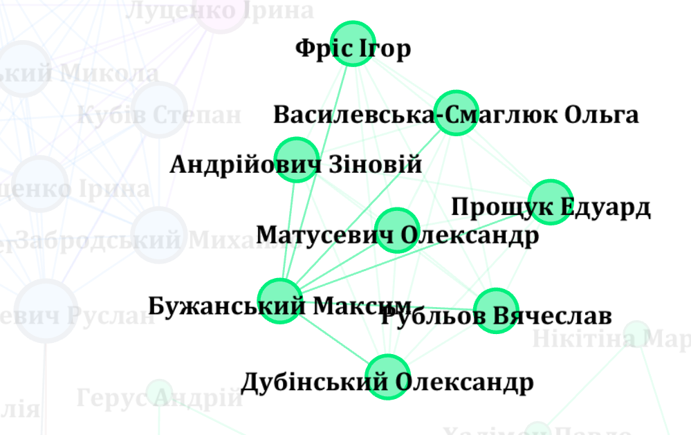 На графике также отчетливо видно так называемую "группу Коломойского”: связи между этими нардепами тоже в своеобразном вакууме и не выходят за пределы этих контактов. Их связь обусловлена поправкой №48, которая имеет 8 авторов, в закон о рынке земли №2178-10 (напомним, что было принято лишь 9 поправок из более 1400 тех, за которые голосовали). Поправка №48, о которой докладывал Игорь Фрис, касалась "земельного сервитута" - "права проезда и прохода к принадлежащему земельному участку". Фрис был автором поправки №3017 этому закону (исправление технической ошибки в нумерации Закона Украины "О государственной регистрации прав на недвижимое имущество»). Фрис и Матусевич подавали вместе поправку №222 к проекту закона №1031. Бужанский еще подавал техническую поправку №285 о деятельности органов судейского управления (№1008). Дубинскому вместе с коллегами принадлежит также комитетская поправка №723 (о конкурсной комиссии при Кабмине) к закону об азартных играх.