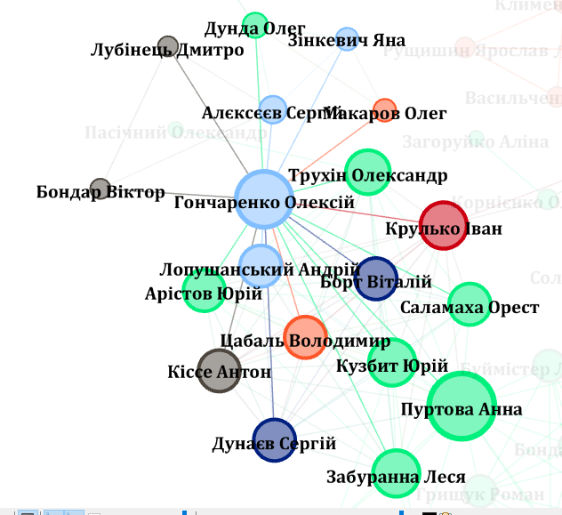На графике ниже, как и на интерактивном графике вверху, также видны несколько группировок из представителей "Слуги народа". Одна группа склонна сотрудничать с членами других фракций и депутатских групп. Она соединена с соседним образованием при посредничестве Анны Пуртовой.