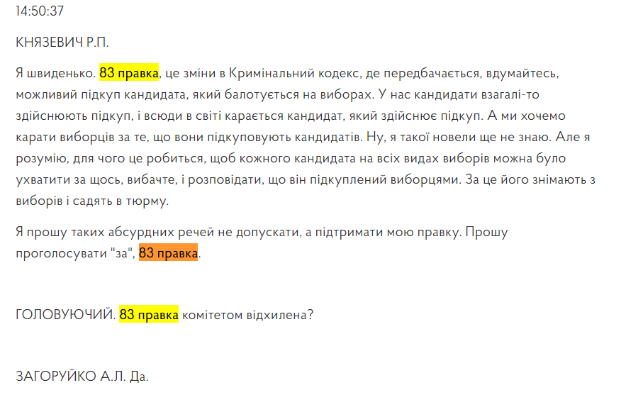 За исключением двух поправок (№83 и №85) от Руслана Князевича ("Европейская солидарность"), большинство изменений в закон внесли представители "Слуги народа". Согласно стенограмме, поправка №83 касалась декриминализации подкупа избирателей. В названии статьи 160 убрали упоминание, которое было в первом чтении, - о "подкупе кандидата, который баллотируется на выборах". В 2018 году мы писали об этих особенностях законодательства и о том, как его нарушают.
