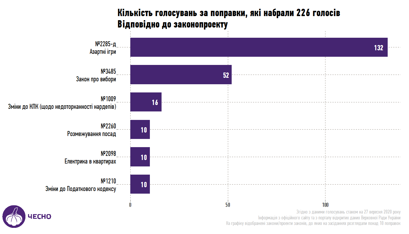 По состоянию на 27 сентября 2020 года в стенах Верховной Рады состоялось 5239 голосований, из которых 3067, или 59%, были голосованиями за поправки к законопроектам. Каждая 10-я поправка, вынесенная на голосование в зал заседаний, набрала необходимые 226 голосов. В целом речь идет о 325 поправках к 49 законам, представленных 136 нардепами. Кто и для чего “спамит” поправками?