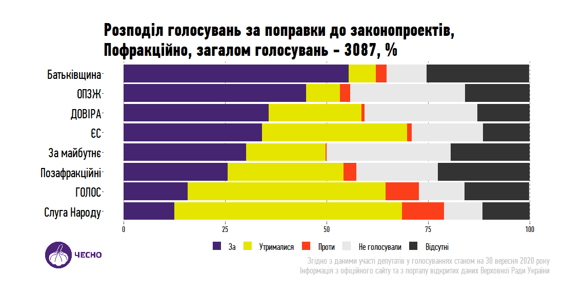 Также заметим, что отличается пофракционное голосование за все поправки, принятые в зале заседаний, и тех, которые набрали 226 голосов. Фракции "Слуга народа" помогает голосами группа “Довіра”, а во время голосований за все поправки чаще всего "за" голосует "Батькивщина".