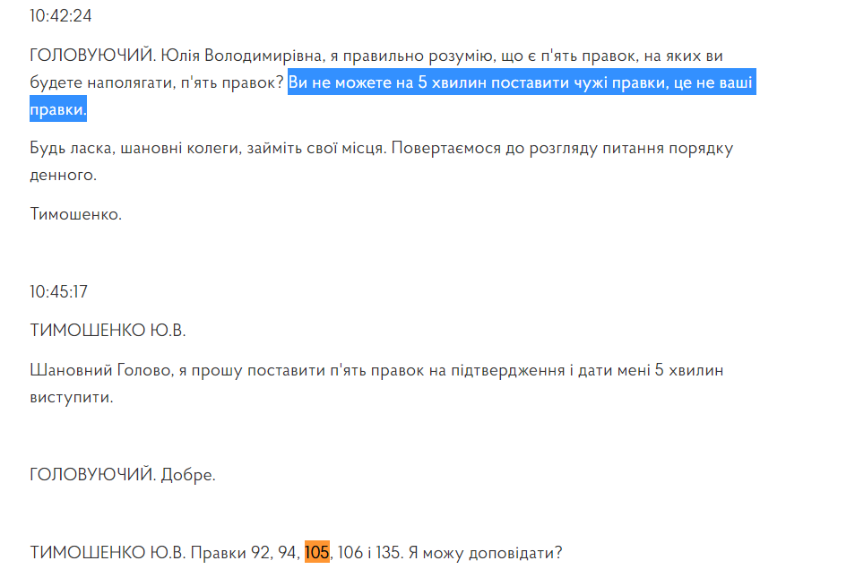 Среди поправок "батькивщиновцы" одобрили только одну - №2311 Ивана Крулько, однако никакого ее обсуждения во время заседания 14 июля не было. Также проголосовала за поправку №2318 Ольга Белькова, однако она сложила мандат в июне. Обсуждение поправки тоже не было.