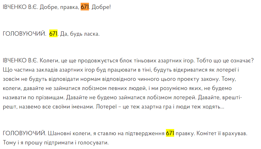 А поправку №225 и несколько других, например №205 и №202, на подтверждение ставил Иван Крулько из "Батькивщины». Первая касалась внедрения термина "идентификационная карточка игрока", другие две - лотерей.