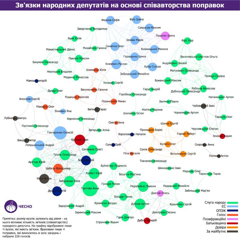 Графика создана в Gephi с помощью алгоритма Фрухтермана-Рейнгольда (Fruchterman-Reingold) для рисования графиков. Размер узла (круга, или нардепа) определяется по расчету уровня (degree) - на него влияет количество связей, то есть в этом случае соавторство поправок с другими нардепами. Нардепы, которые сложили мандат, окрашены в цвет внефракционных депутатов. Речь идет, например, об Ирине Луценко и Ольге Бельковой.