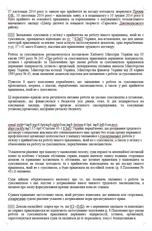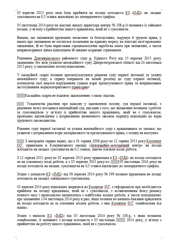 В частности, из этого решения следует, что в ноябре 2014 г. Косенчук А. Г. обратилась в суд с иском и, уточнив его, просила отменить приказ коммунального учреждения «Инновационно-методический центр» от 5 ноября 2014 № 108 о ее увольнении с занимаемой должности методиста КУ «ИМЦ», восстановить ее на работе в этой должности, взыскать с ответчика в ее пользу 16 338 грн 60 коп. среднего заработка за время вынужденного прогула с 5 ноября 2014 и 10 000 грн на возмещение морального ущерба.