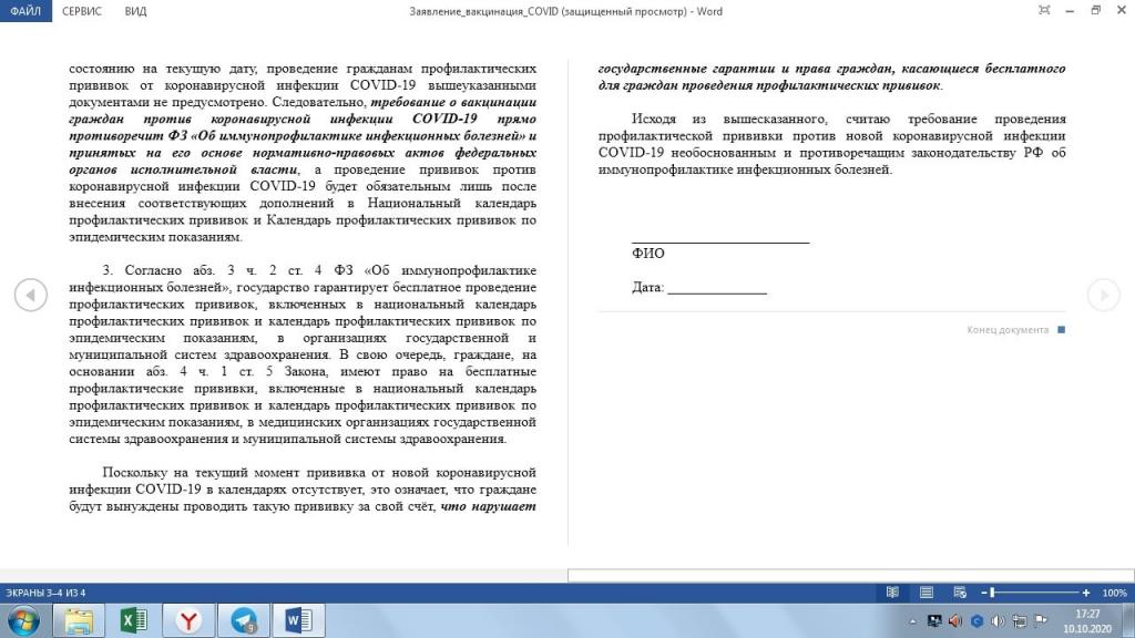 «Если Вас заставляют делать прививку, можете смело скачать это заявление, заполнить его и отдать работодателю. Никто не имеет право Вас уволить, а уж тем более принудительно заставить вакцинироваться. Заявление составлено юристами», — говорится в сообщении.