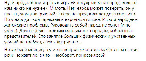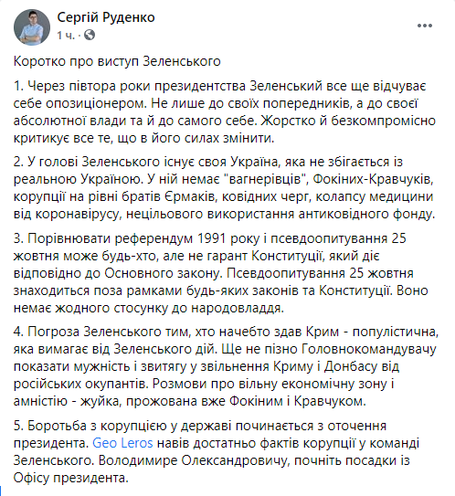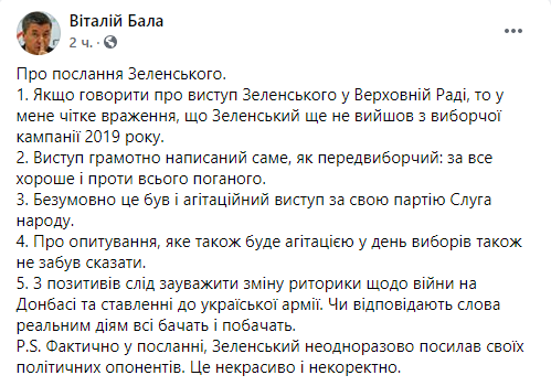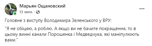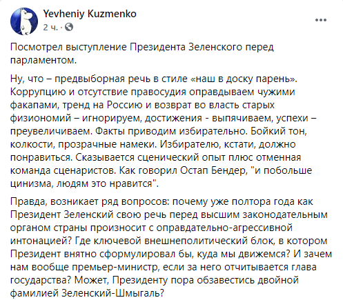 Некоторые политики уже назвали выступление Зеленского в парламенте агитацией за партию “Слуга народа” перед местными выборами и обвинили его в оторванности от украинских реалий. Речь в стиле “все хорошо” на фоне катастрофической ситуации в стране изрядно разозлила пользователей украинского сегмента Facebook. Другим же происходящее напомнило съезды КПСС, ведь “слуги” просто взрывались в овациях после каждой фразы Зеленского.