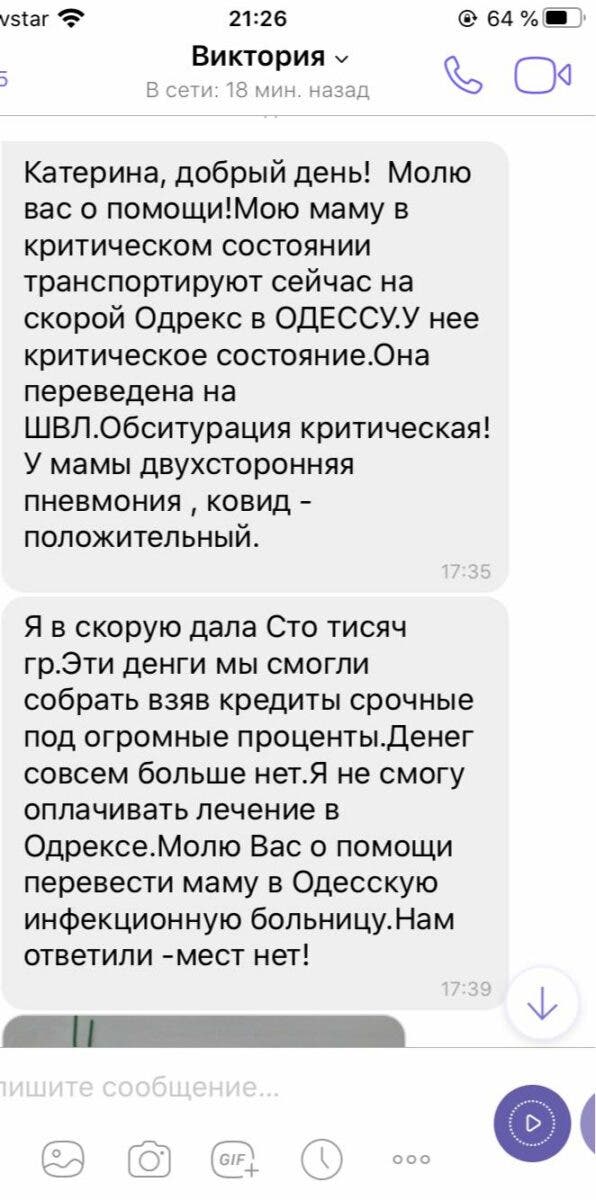 Позже к Ножевниковой обратилась дочь другой женщины с подтвержденным диагнозом COVID-19 в критическом состоянии. Сначала женщину лечили в частной клинике, так как в государственном медучреждении ее отказались принимать из-за нехватки мест.