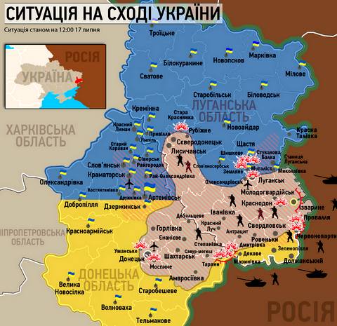 Для того чтобы убедиться в этом, достаточно взглянуть на карты-схемы боевых действий, которые регулярно публиковались (и публикуются по сей день) Информационно-аналитическим отделом СНБО Украины. Вот, например, карта по состоянию на 14 июля (см. рис. 2). Ничего существенного на «южном фланге фронта» (район Старобешево, Амвросиевка) не изменилось и к полудню 17 июля (см. рис. 3), и в последующие несколько дней июля.