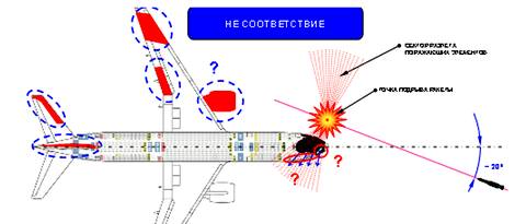 «Даже поверхностный анализ условий встречи ракеты с самолетом показывает, что при пуске ракеты из любой точки в районе «Снежное» поражающими элементами была бы поражена только носовая часть самолета, и не могло быть повреждений крыла, двигателя и тем более стабилизатора и хвостового оперения… При такой ориентации ракеты основное направление движения поражающих элементов — поперек конструкции самолета. В этом случае боевая часть ракеты отсекла бы носовую часть самолета…»