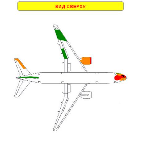 «Эксперты» делают вид, что не понимают, чем в этом случае могли быть вызваны«повреждения левого крыла, двигателя и тем более стабилизатора и хвостового оперения». Для начала уточним: какие это были повреждения? Дабы не тратить время на лишние споры, просто воспользуемся схемой из их доклада (см. рис. 5). Повреждения «средней степени» (по их же собственной терминологии) отмечены только на левом двигателе и носке левого стабилизатора, все остальное (зеленый цвет на схеме) — этоскользящие повреждения (рикошеты) во внешней обшивке самолета».