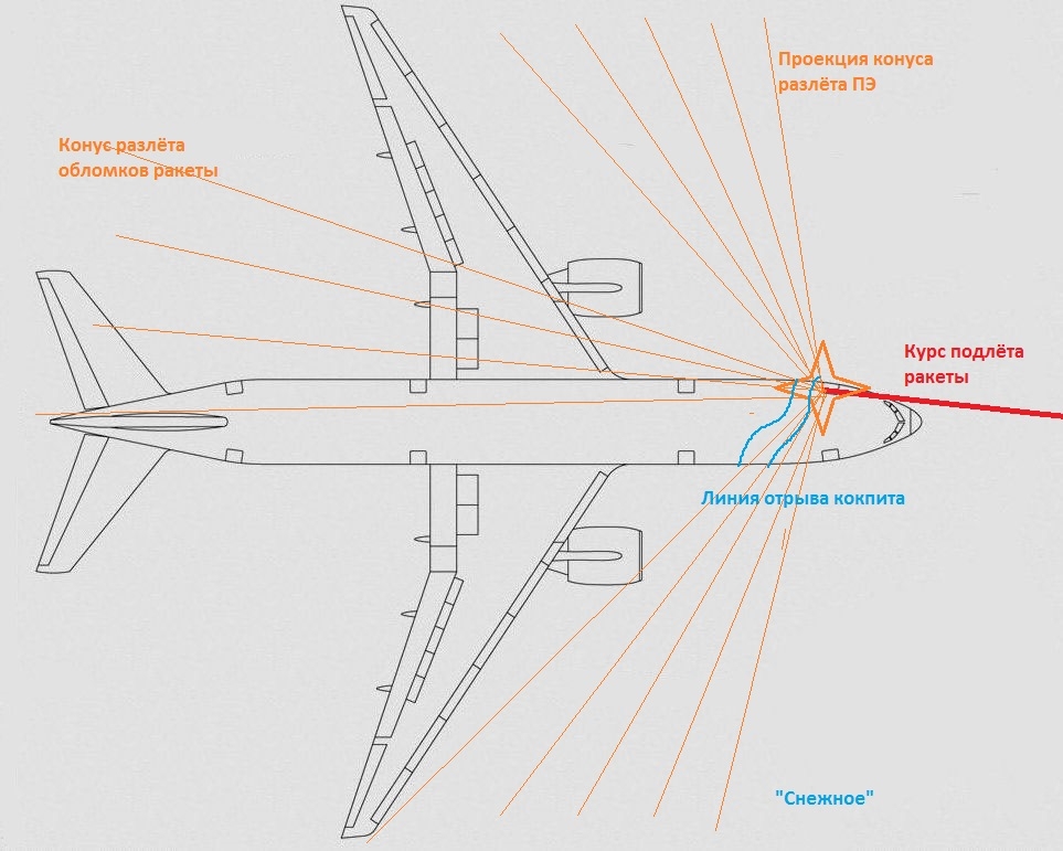 Падая с высоты 10 км, носовая часть пролетела вперед всего лишь 2,3 км. Это почти отвесное падение; всё остальное (фюзеляж, крылья, хвостовое оперение) летело гораздо дольше и дальше. Перерубить огромный (диаметр 6,2 м) фюзеляж, да еще и в районе кабины пилотов (там, где осколки будут неизбежно тормозиться и застревать в многочисленных корпусах приборов и оборудования) непросто. Условия для этого возникают только в том случае, когда ракета подошла к самолету на встречном курсе, почти «лоб в лоб», с минимальным (единицы метров) промахом, и «основное направление движения поражающих элементов — поперек конструкции самолета». Именно такое взаимное положение ракеты и самолета возникает в случае запуска из района Снежное.