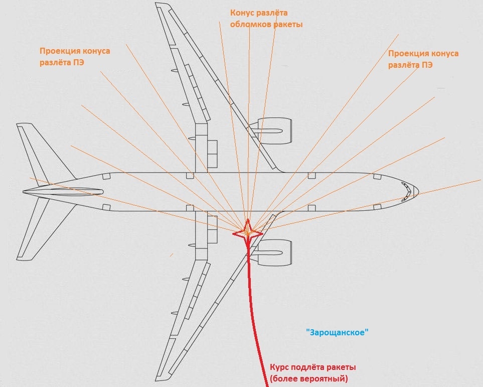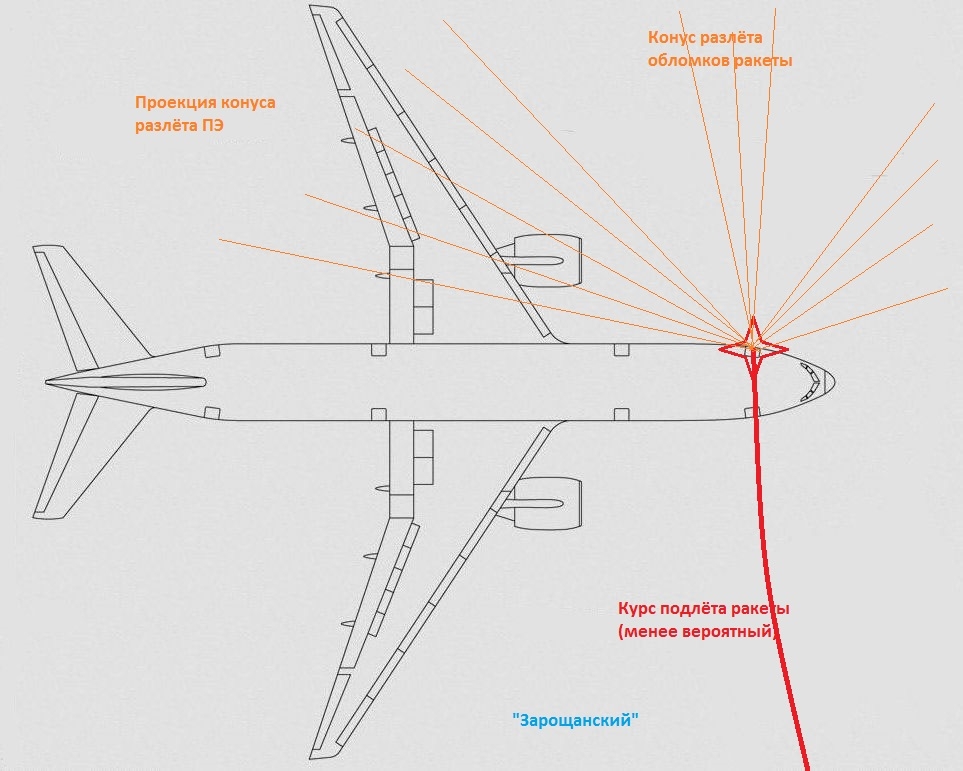 Подрыв БЧ ракеты в районе правого двигателя приведет к тому, что основной поток скоростных ПЭ оторвет правое крыло, с большой долей вероятности вызовет возгорание топлива в крыльевых баках. Фюзеляж будем поврежден в центральной своей части, предсказать степень повреждения трудно, т.к. фрагменты раздробленного корпуса ракеты имеют непредсказуемые размеры и массу. Повреждения носовой части фюзеляжа — и кабины пилотов в частности — будут в этом случае минимальными. Короче говоря: получается картина, НИЧЕГО ОБЩЕГО не имеющая с реальным разрушением «Боинга» рейса MH-17.