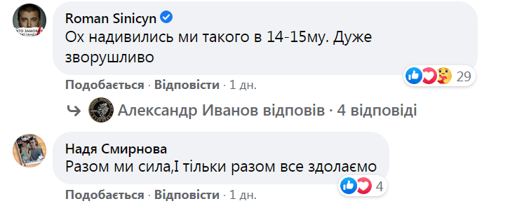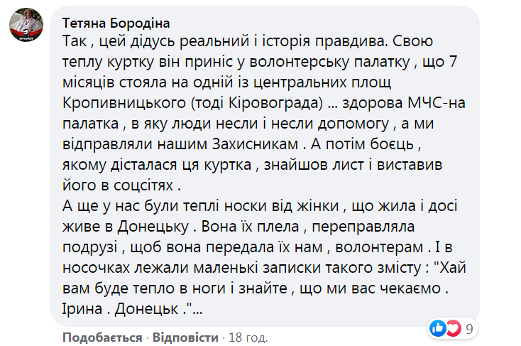 "До слез... Спасибо каждому из вас", "Ох, насмотрелись мы такого в 14-15-м. Очень трогательно", "Вместе мы сила, и только вместе все преодолеем", "Это не легенда, а правда. Батальон "Горынь", "Да, этот дедушка реальный, и история правдивая. Свою теплую куртку он принес в волонтерскую палатку, которая семь месяцев стояла на одной из центральных площадей Кропивницкого (тогда Кировограда)", – отметили патриоты.