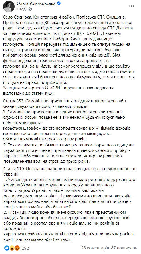 В Сумской области в селе Сосновка Конотопского района зафиксировали работу незаконного избирательного участка. Он организовал голосование в сельский совет, который отказался входить в состав ОТО.