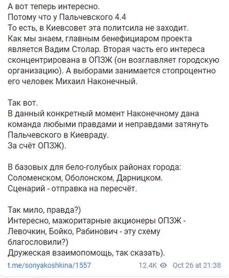 По информации журналистки, в городской совет Киева проходят партии «Удар» и «Европейская Солидарность», у них по 20%, «Единство» — 8,6%; ОПЗЖ — 7,7%; «Батьківщина» — 7,4%; «Слуга народа» — 7,4%; «Голос» — 5,9%.