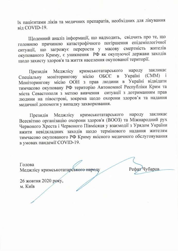 Президія Меджлісу закликає СММ ОБСЄ в Україні та Моніторингову місію ООН з прав людини в Україні відвідати тимчасово окуповану РФ територію Автономної Республіки Крим з метою вивчення ситуації з дотриманням прав людини на півострові, зокрема щодо охорони здоров’я та надання медичної допомоги у випадку захворювання. Також відомство закликає ВООЗ надати жителям тимчасово окупованого РФ Криму якісного медичного обслуговування в умовах пандемії.