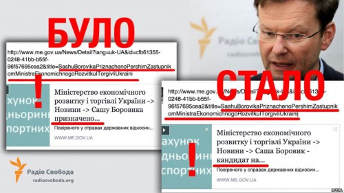 Пресс-служба Министерства экономического развития и торговли Украины задним числом изменила новость за 16 марта о том, что бывший поверенный в делах государственных отношений компании Microsoft Александр Боровик был назначен первым заместителем главы Минэкономразвития. Об этом в своем Facebook написала главный редактор киевского бюро «Радіо Свобода» Инна Кузнецова.