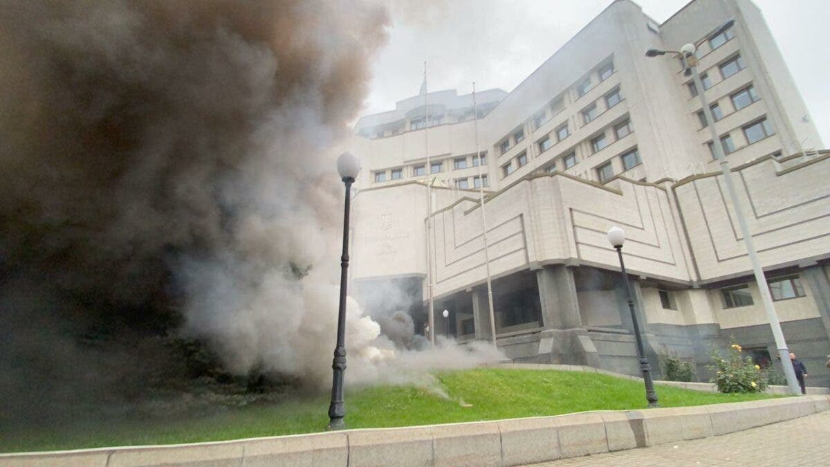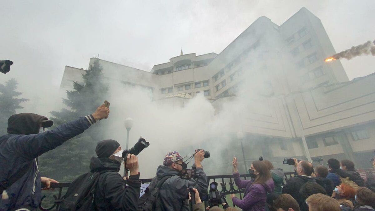 Активисты принесли под здание КСУ чемоданы для судей. Они считают, что судьи КСУ должны покинуть Украину и выехать в Россию. На акции присутствуют глава Центра противодейтствия коррупции Виталий Шабунин, нардеп от «Голоса» Кира Рудык, ряд депутатов от «Слуги народа», активист Сергей Стерненко и другие.