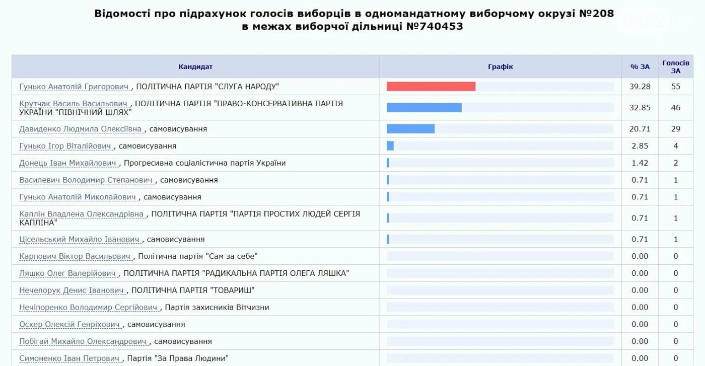 Нагадаємо, за результатами опрацювання усіх 100% протоколів з мокрими печатками на сайті ЦВК з’явилися остаточні цифри по округу №208. Олег Ляшко за даними комісії зібрав 19 799 голосів (31,78 %), а Анатолій Гунько від «Слуги народу» - 21 245 (34,10 %).